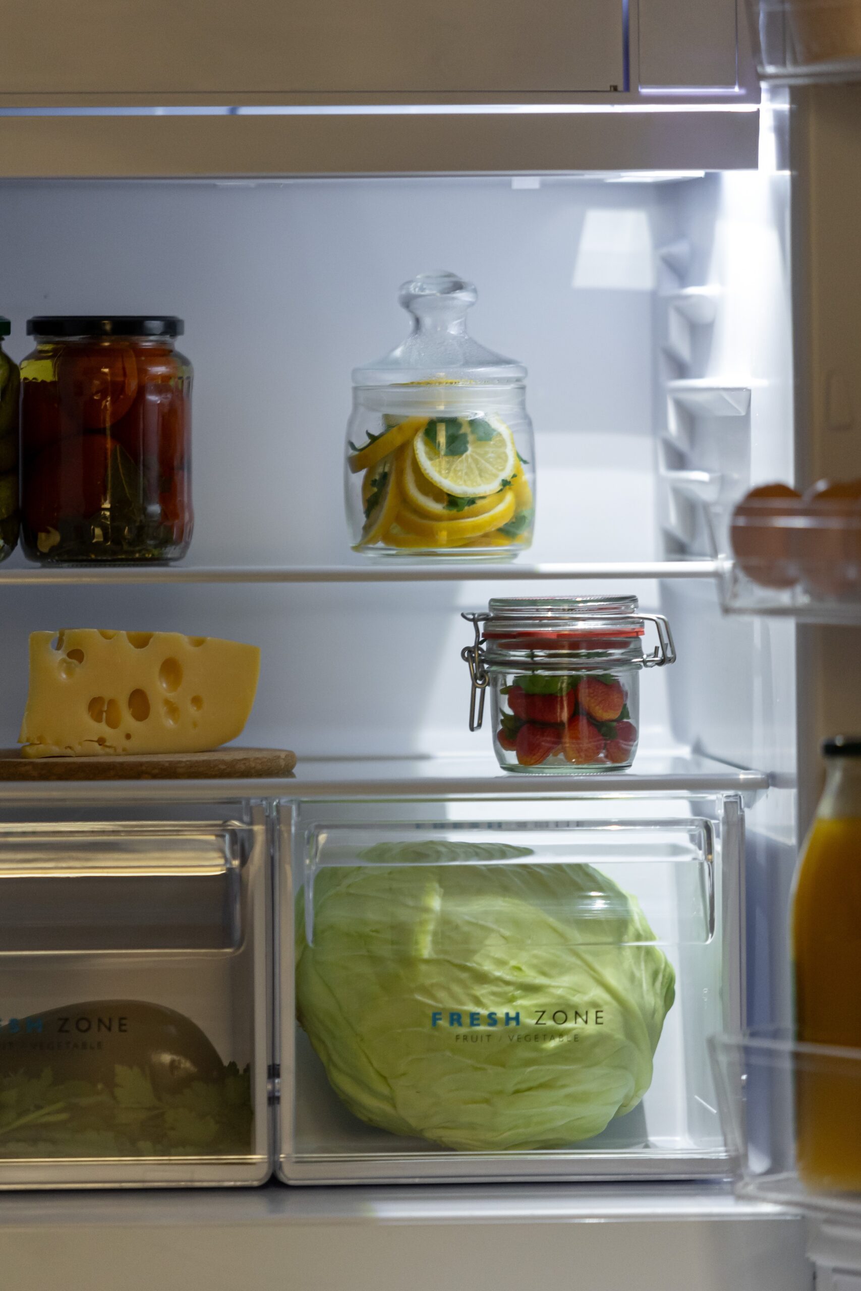 Общий объём холодильника составляет 150 литров, из которых 116 литров приходится на холодильную камеру, а 34 литра — на морозильный отсек. Внутри вы найдёте удобные полки и ящики, которые помогут организовать пространство для хранения продуктов.