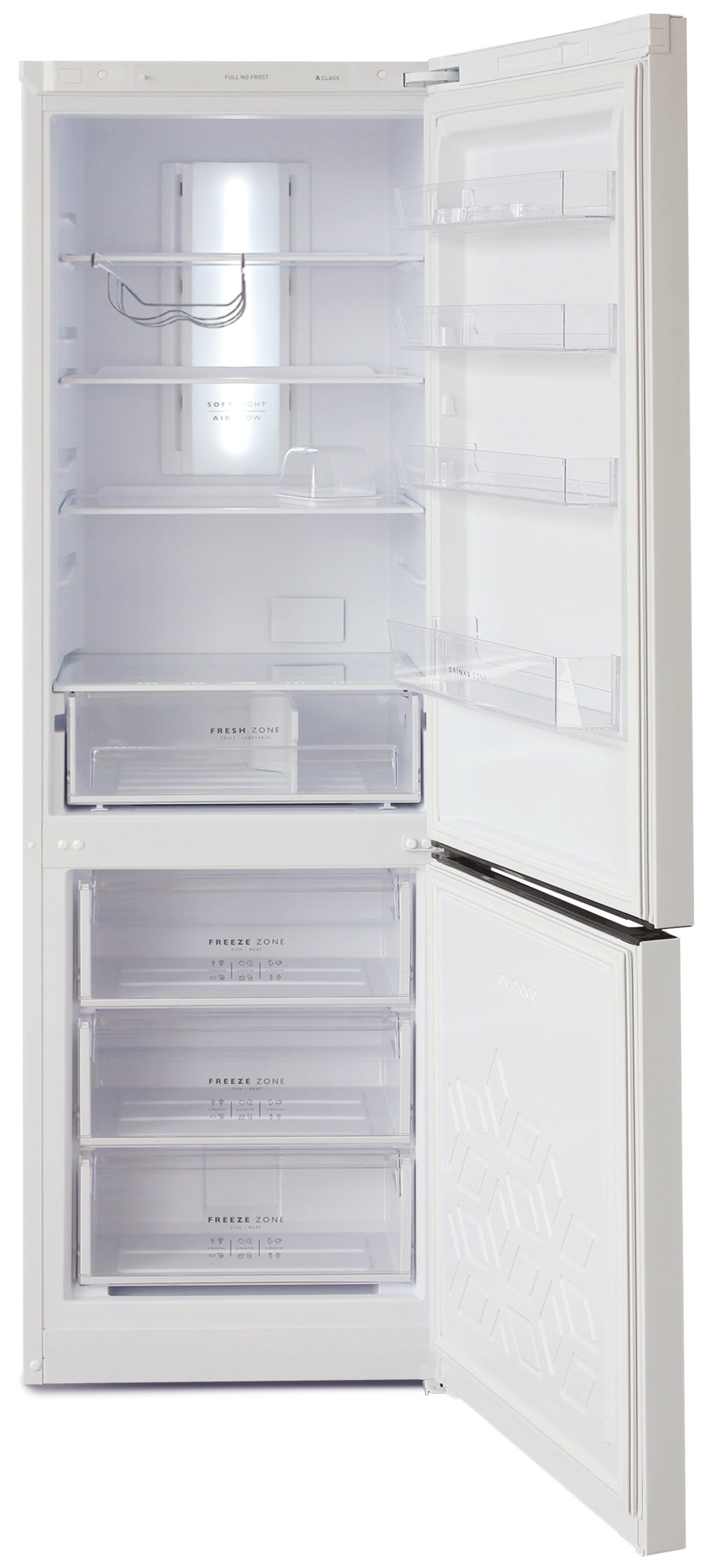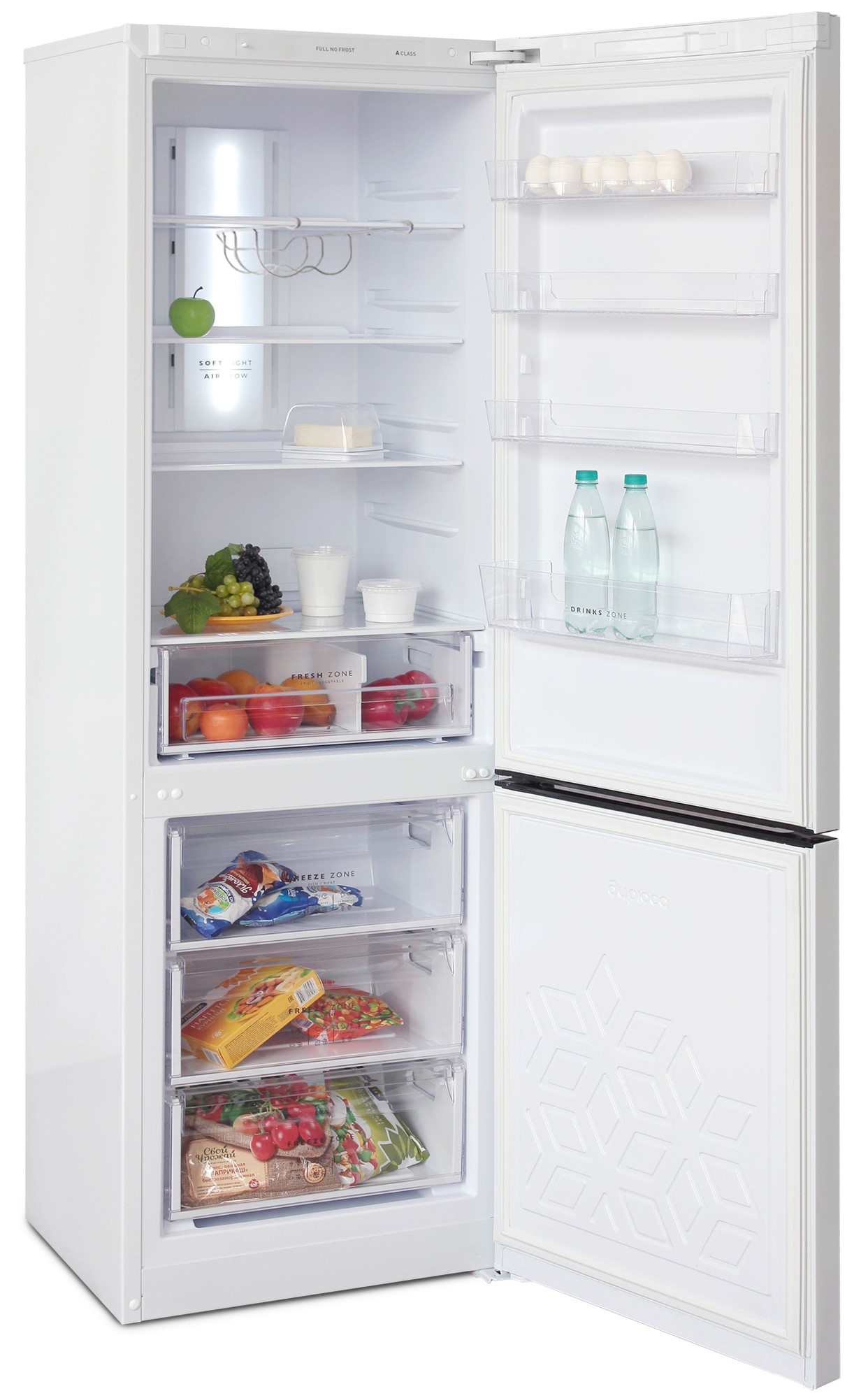 Холодильник Бирюса 960NF в белом цвете станет стильным и функциональным дополнением вашей кухни. Двухкамерная модель с нижней морозильной камерой оснащена системой Full No Frost, которая предотвращает образование наледи.