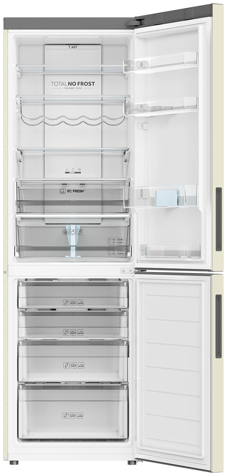 В зоне свежести, где поддерживается влажность до 50%, комфортно хранятся мясо, рыба и молочная продукция — без потери вкуса и качества. Холодильник выполнен в прочном металлическом корпусе бежевого цвета, устойчивом к царапинам и коррозии, поэтому со временем он не теряет аккуратный внешний вид. Благодаря технологии No Frost холодный воздух циркулирует внутри камер, предотвращая образование инея и избавляя от необходимости регулярной разморозки. Высоту полок в Haier C2F636CCRGU1 можно менять в зависимости от габаритов посуды и упаковок, что делает организацию внутреннего пространства максимально гибкой. Дополнительную безопасность обеспечивает функция блокировки — она защищает настройки от случайного изменения.