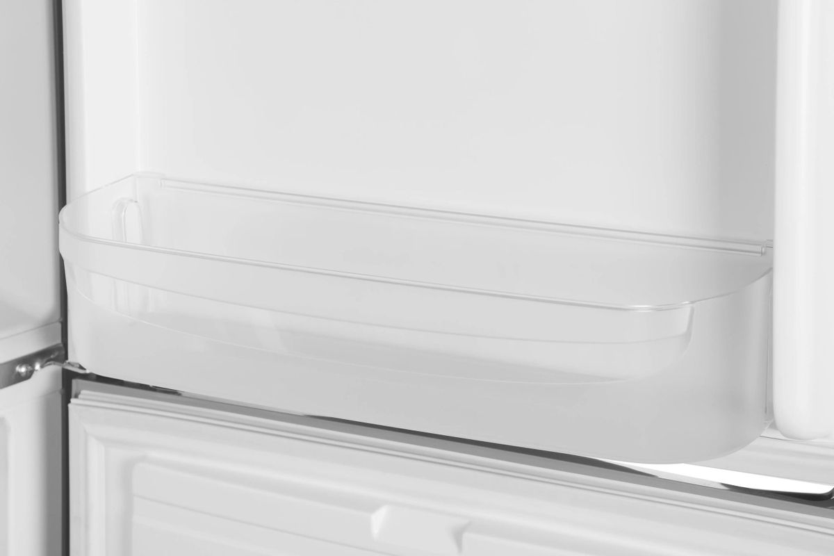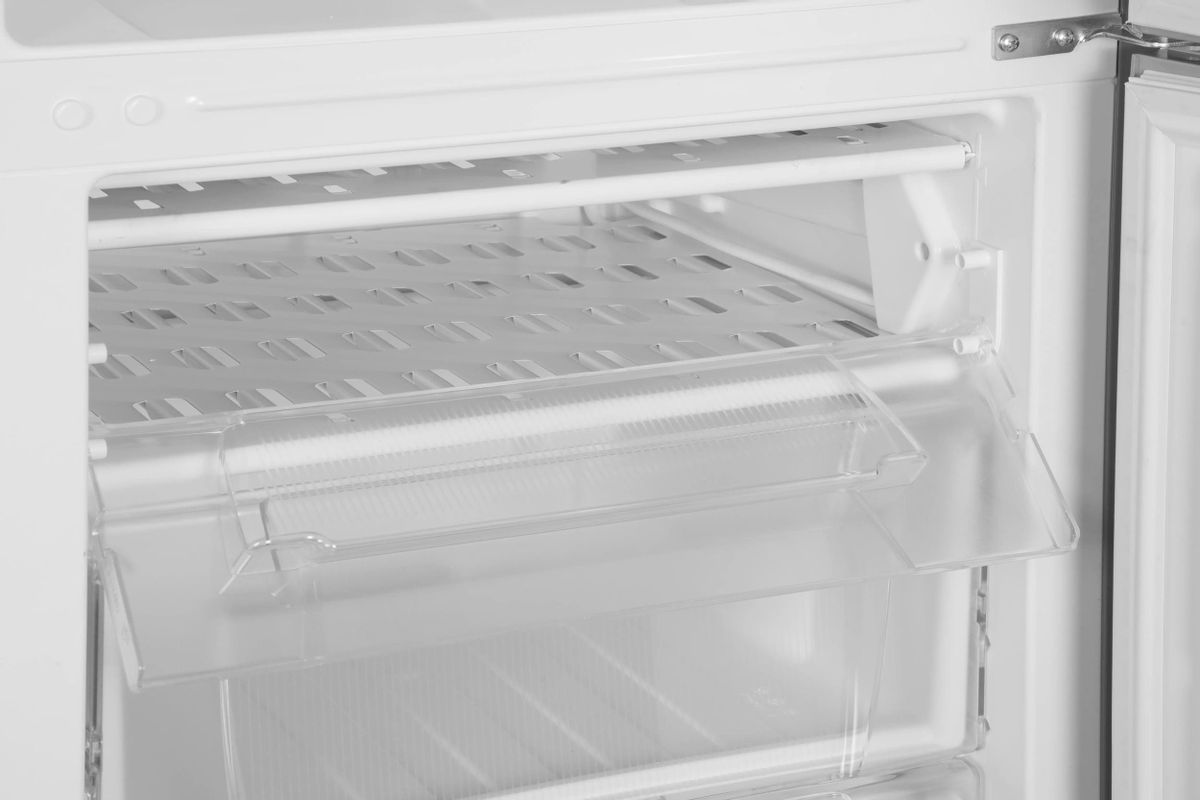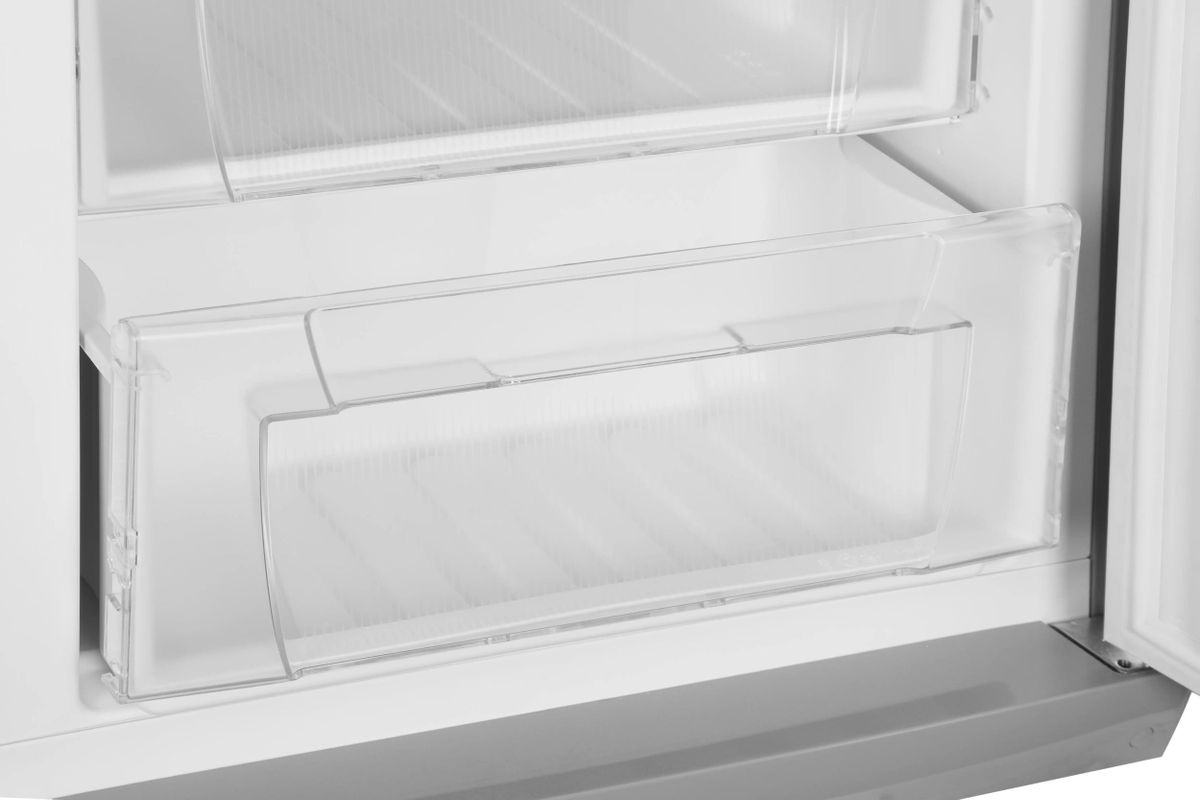 Система размораживания в холодильной и морозильной камерах — ручная, что упрощает обслуживание. В холодильной камере есть три полки из закалённого стекла и два ящика, а в морозильной — три ящика.